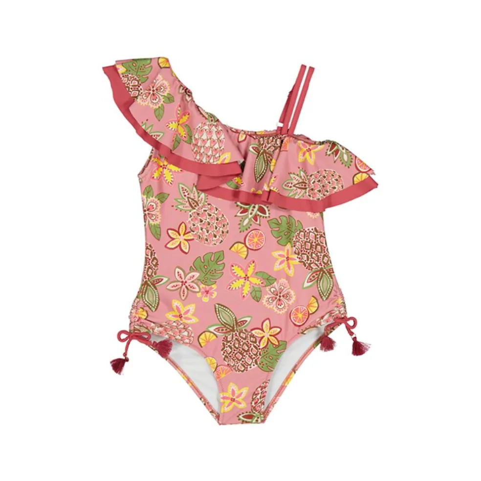 Gorgeous print swimming costume with ruched tied detailing at the side. Off the shoulder design finished with ruffles and an adjustable strap.
