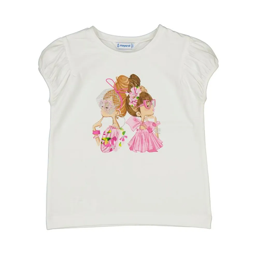 Short sleeved t shirt with a girl printed design on the front which is finished with a silver glitter trim.