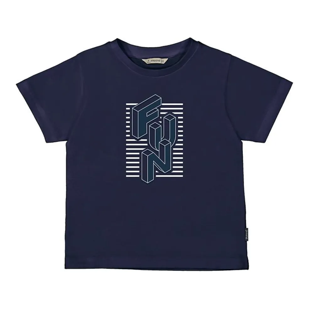 Short sleeved t shirt with a round neckline finished with an embossed 3 dimensional ‘FUN’ design on the front.