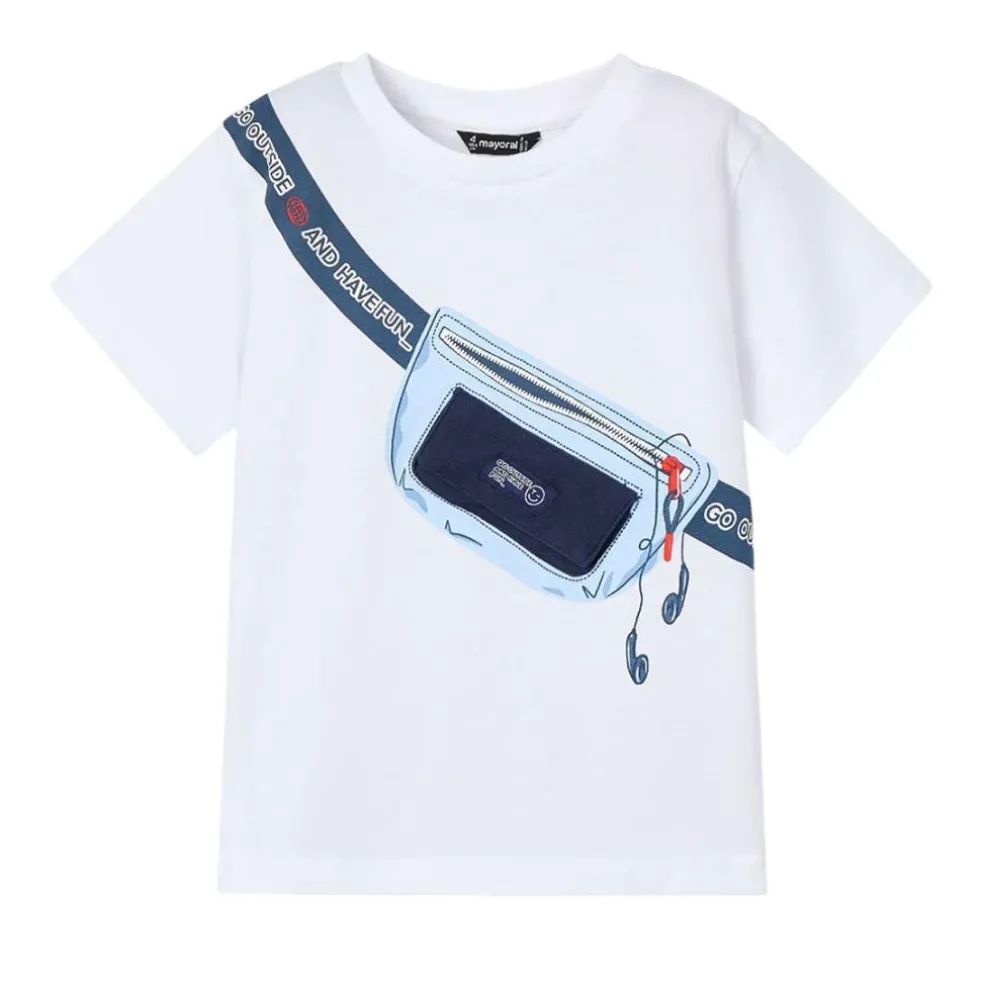 Short sleeved t shirt with a round neckline finished with a printed and appliquéd bag across the chest.