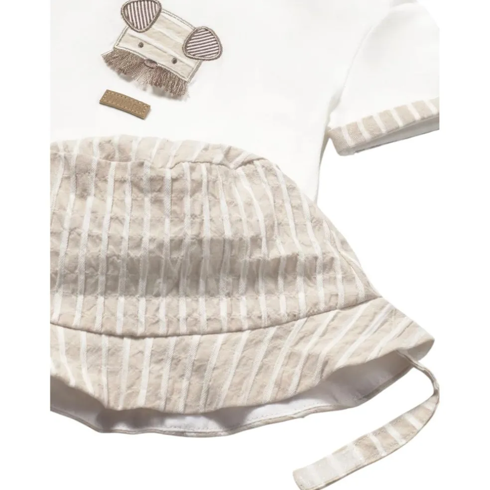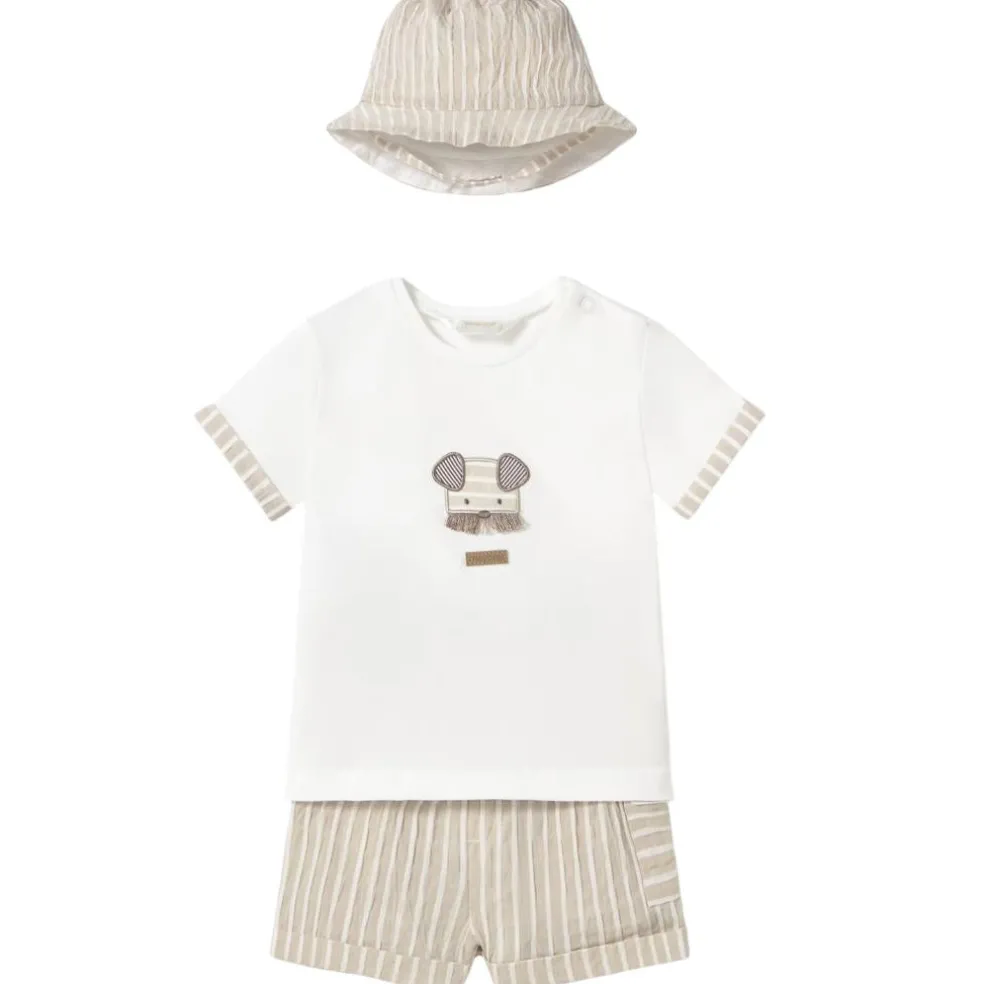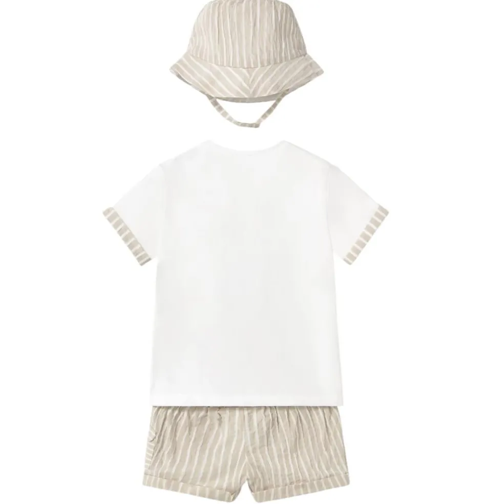Short sleeved t shirt with contrasting detailing to sleeve edges finished with an appliquéd dog on the front, matching beige and white seersucker shorts have a fully elasticated waistband, turn up detailing to the hem and an appliquéd cargo style pocket on one side.