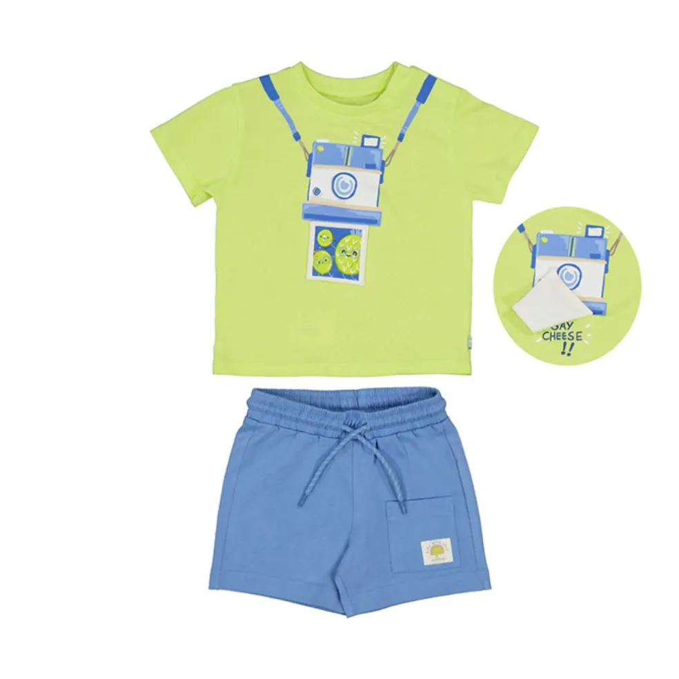 Short sleeved t shirt with a round neckline and printed design on the front, matching shorts have an elasticated drawstring waistband and an appliqued pocket on the front.