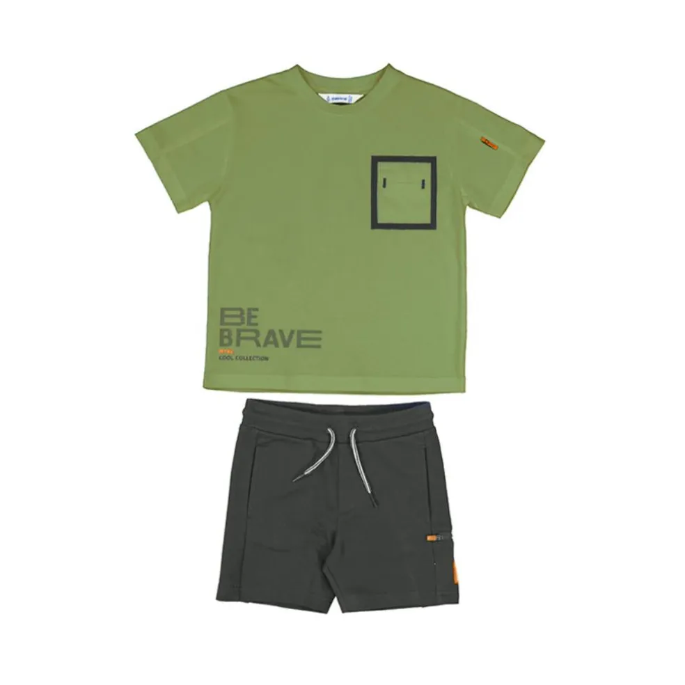 Short sleeved t shirt with a printed design on the front and a round neckline, contrasting sweatshirt shorts have an elasticated drawstring waistband and zip pocket detailing on one leg.