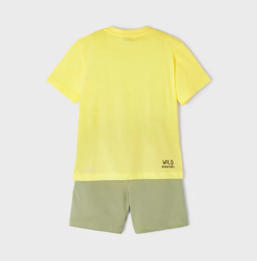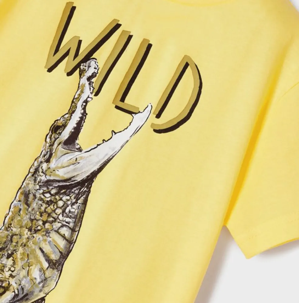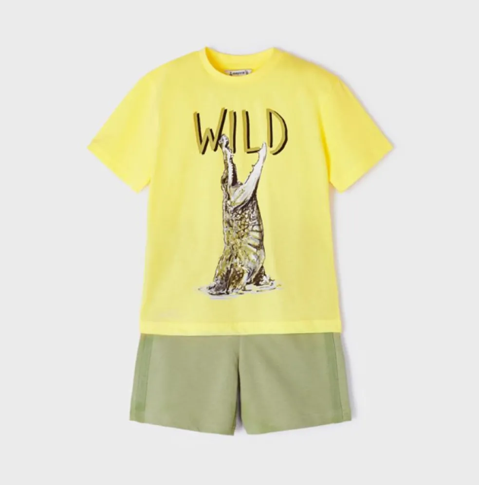 Short sleeved t shirt with a round neckline and an alligator printed motif on the front, matching sweatshirt shorts have side pockets and an elasticated waistband.