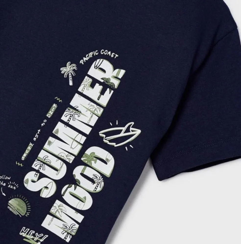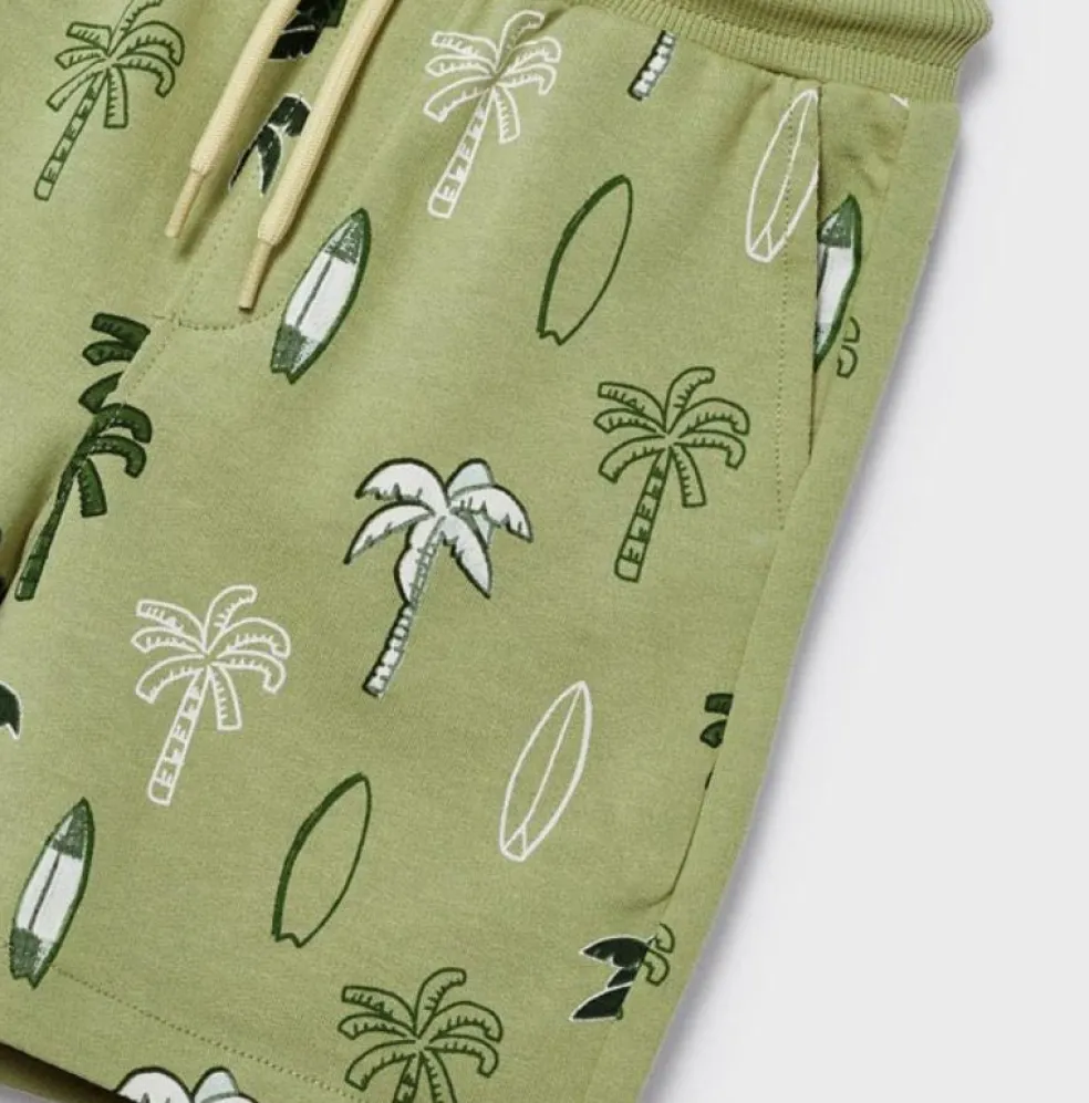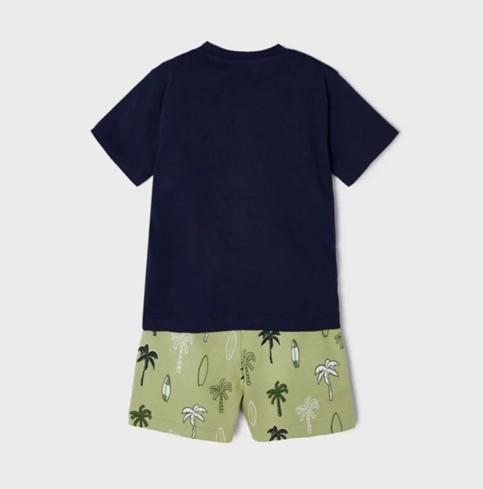 Short sleeved t shirt with a round neckline and a printed design on the front, matching shorts have an all over printed palm tree design and an elasticated drawstring waistband.