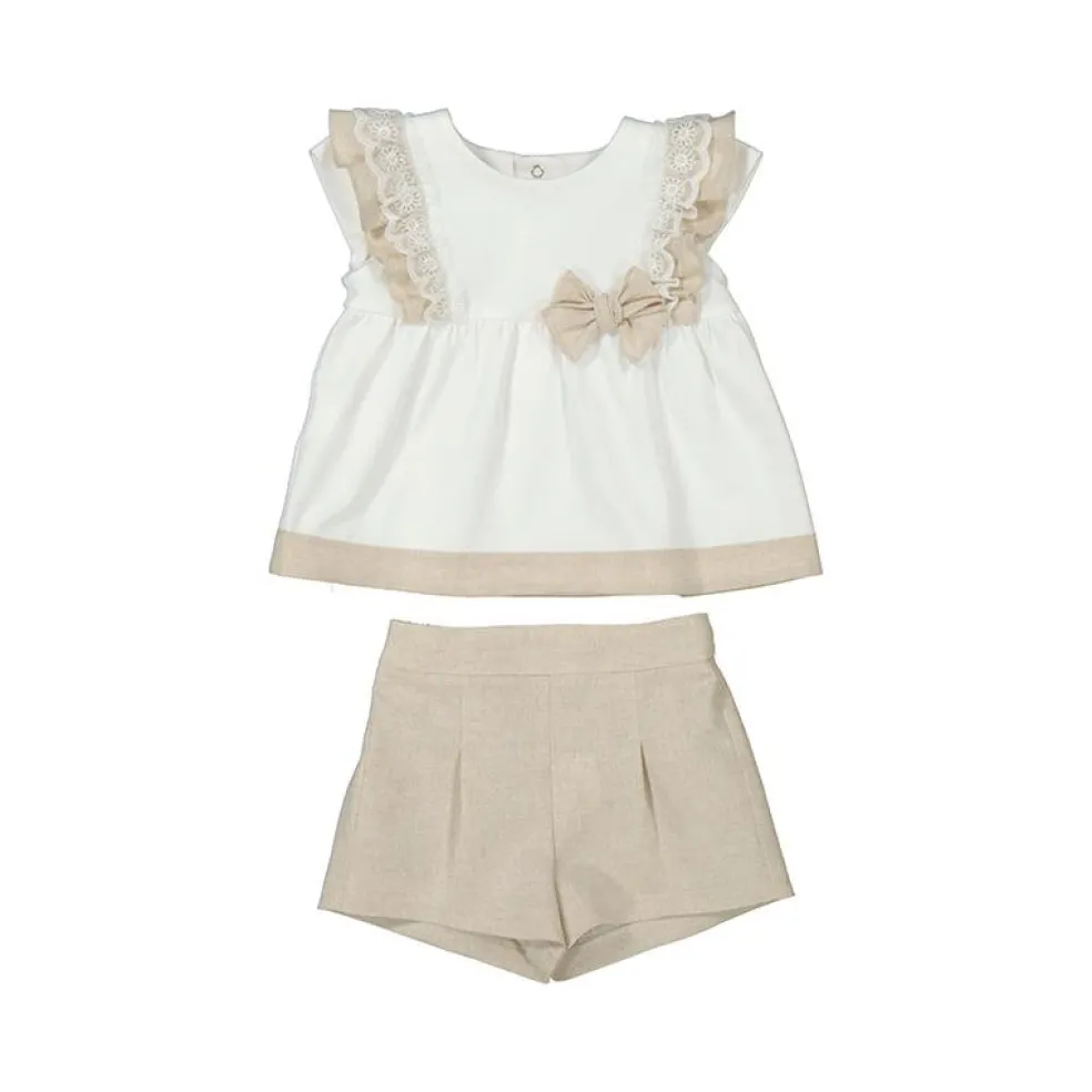 Short sleeved jersey top with a contrasting lace trimmed linen ruffle sleeve finished with an appliquéd linen bow on the front and a contrasting linen hemline.