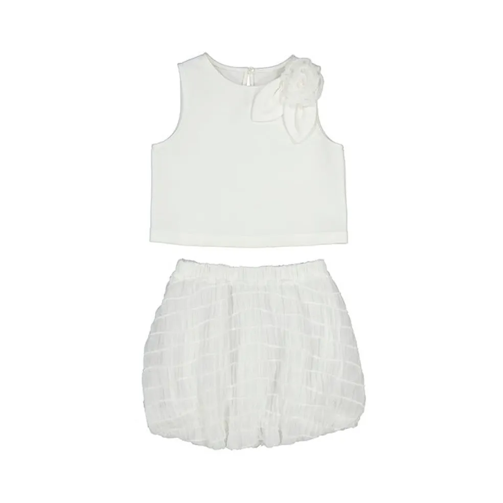 Sleeveless waist length top with a single back button fastening and appliquéd flower on 1 shoulder. Matching full lined puff ball skirt has a fully elasticated waistband.
