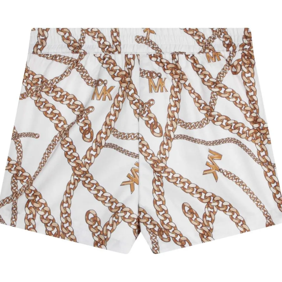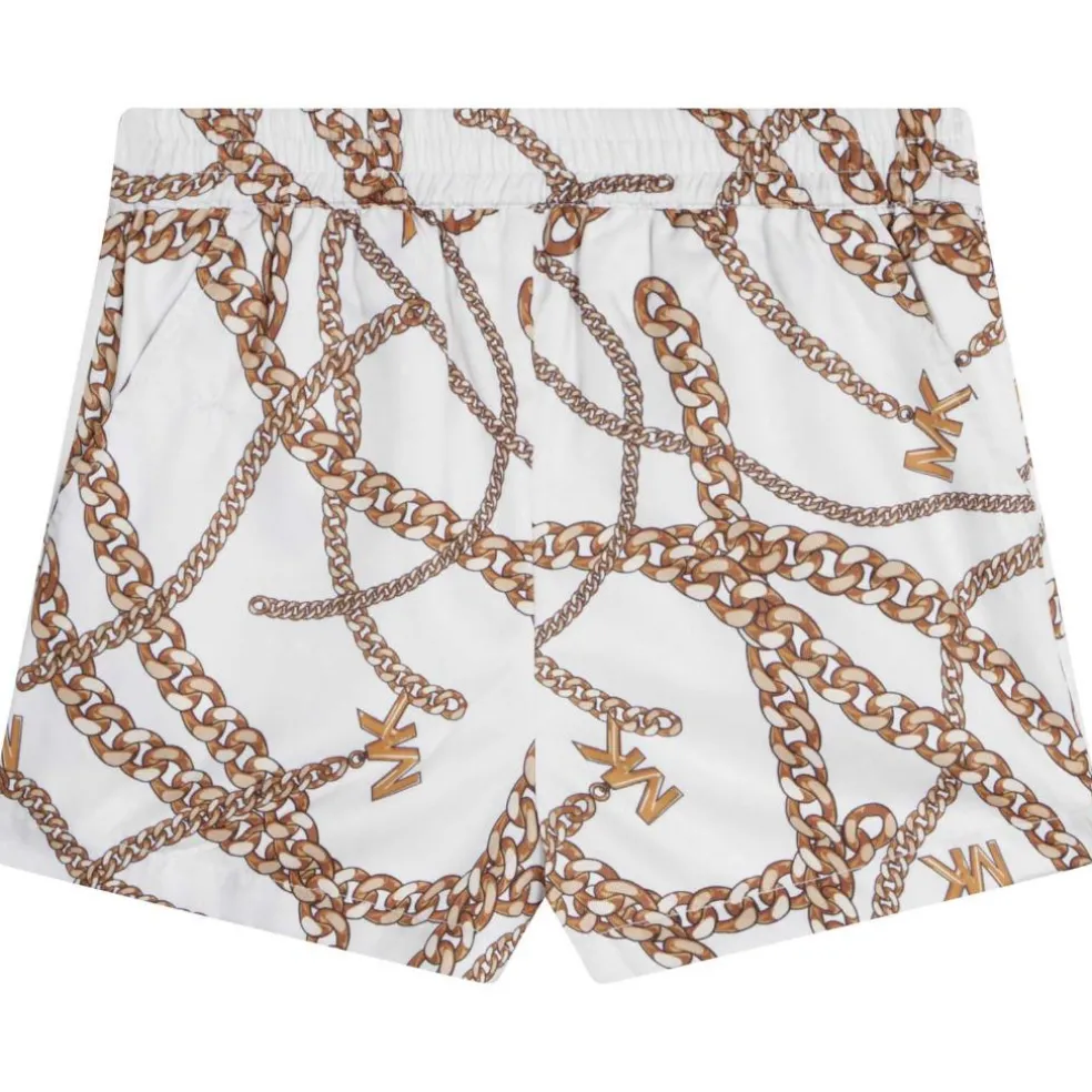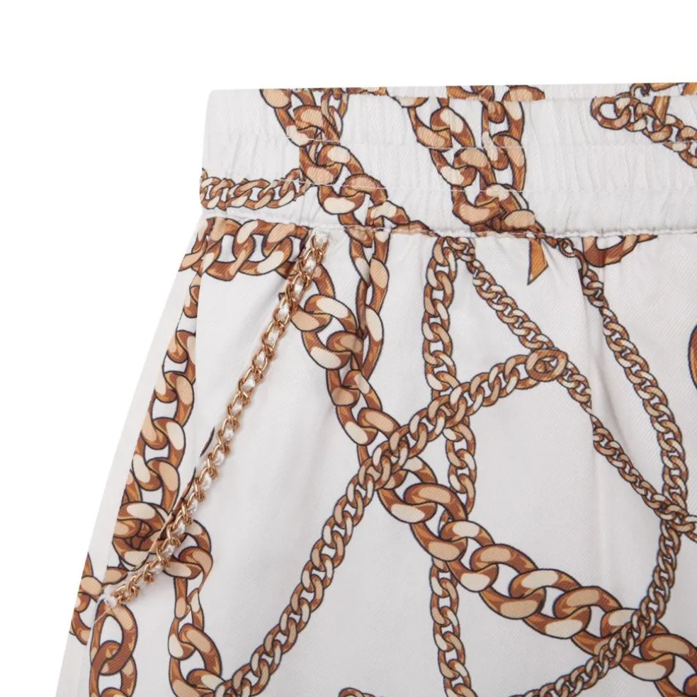 Polyester twill shorts with chain print. Loose fit with elastic waistband. Embroidered chain braid on pocket entry.