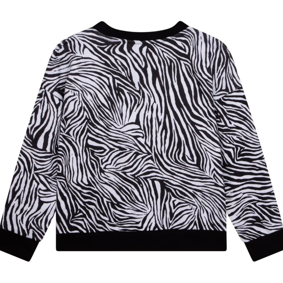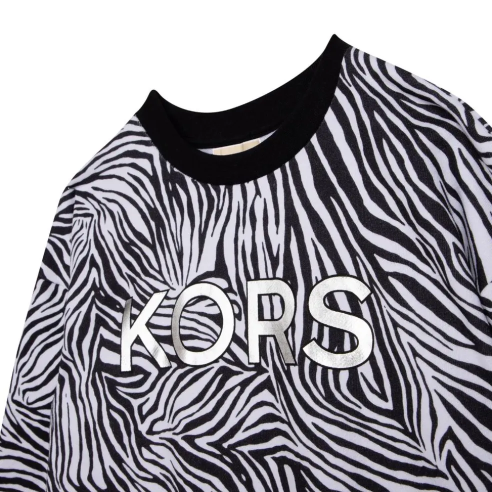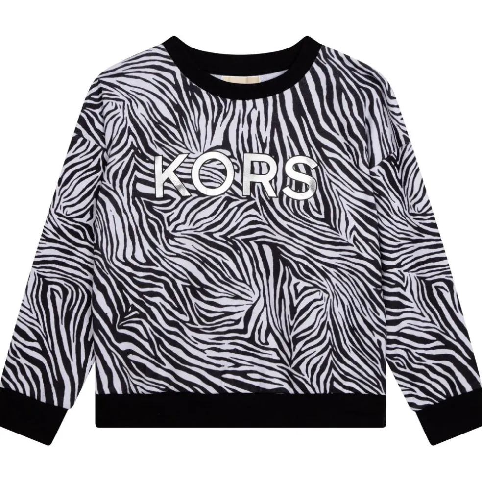 French terry long sleeved sweatshirt with ribbed neckline, cuffs and hemline. Zebra pattern print, with “KORS” logo in metallic print on the front