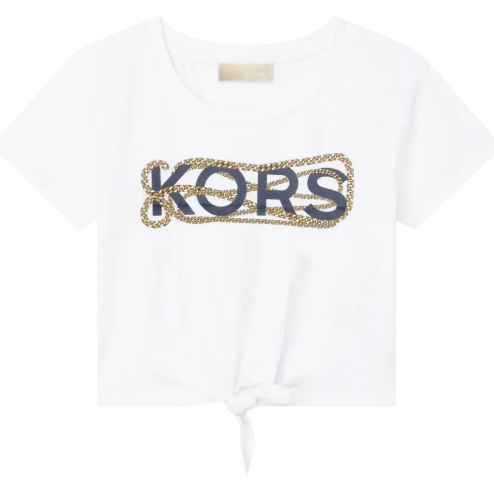 Jersey T-shirt, short sleeves. Crop shape with a knotted tie at bottom front. Printed “KORS” logo with gold chains.