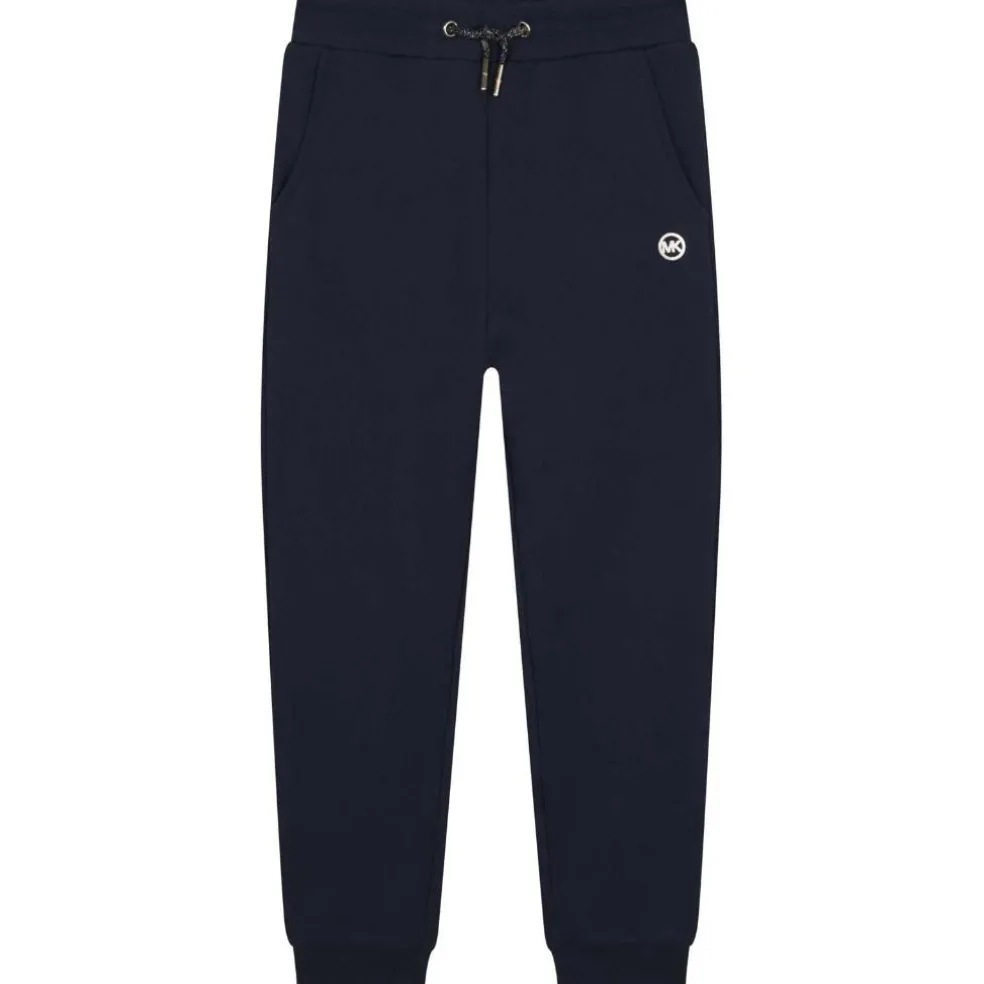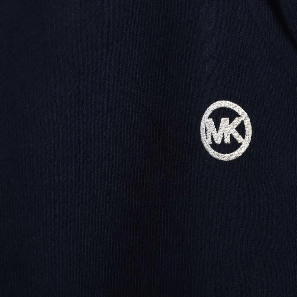 Navy fleece jogging trousers. Elasticated waistband and ankles. Metallic print on front with “MK”.