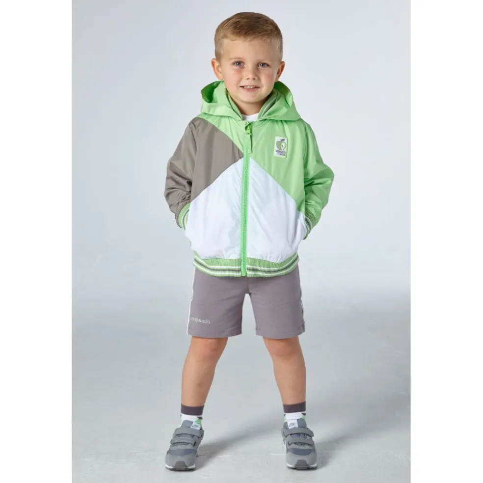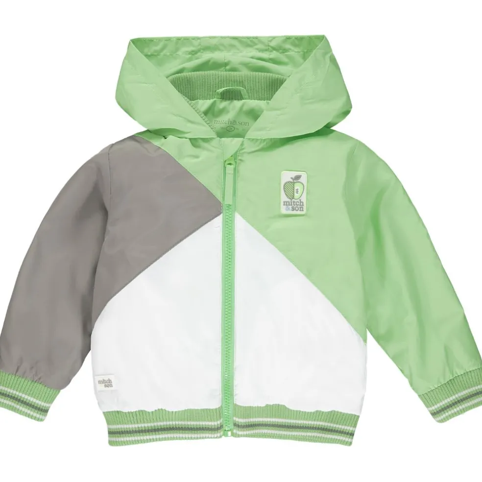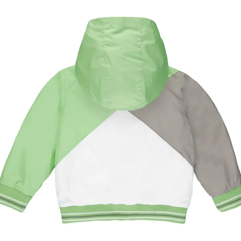 Lightweight hooded jacket with diagonal cut n sew design, stripe rib on cuffs and waistband and rubber logo badge on chest.