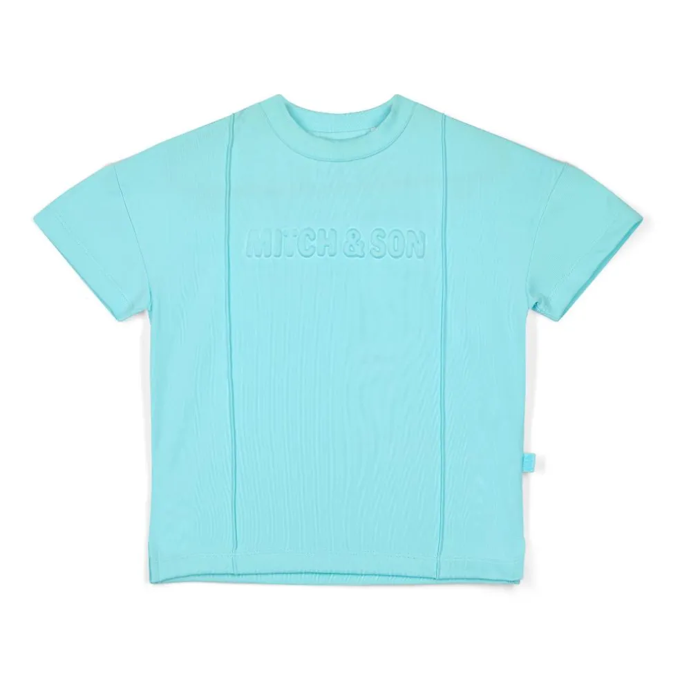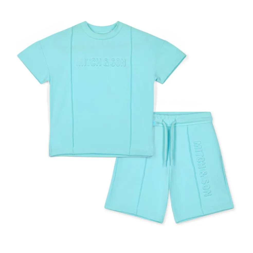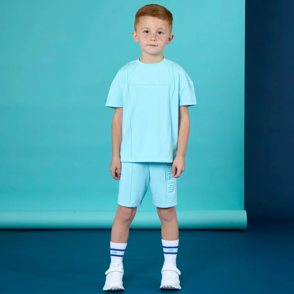 Soft touch drop shoulder sweat t-shirt and short set with front seam detailing and embossed and de-embossed logo artwork on both the top and shorts.