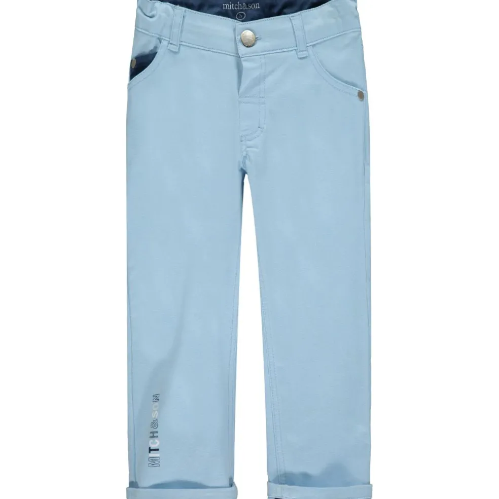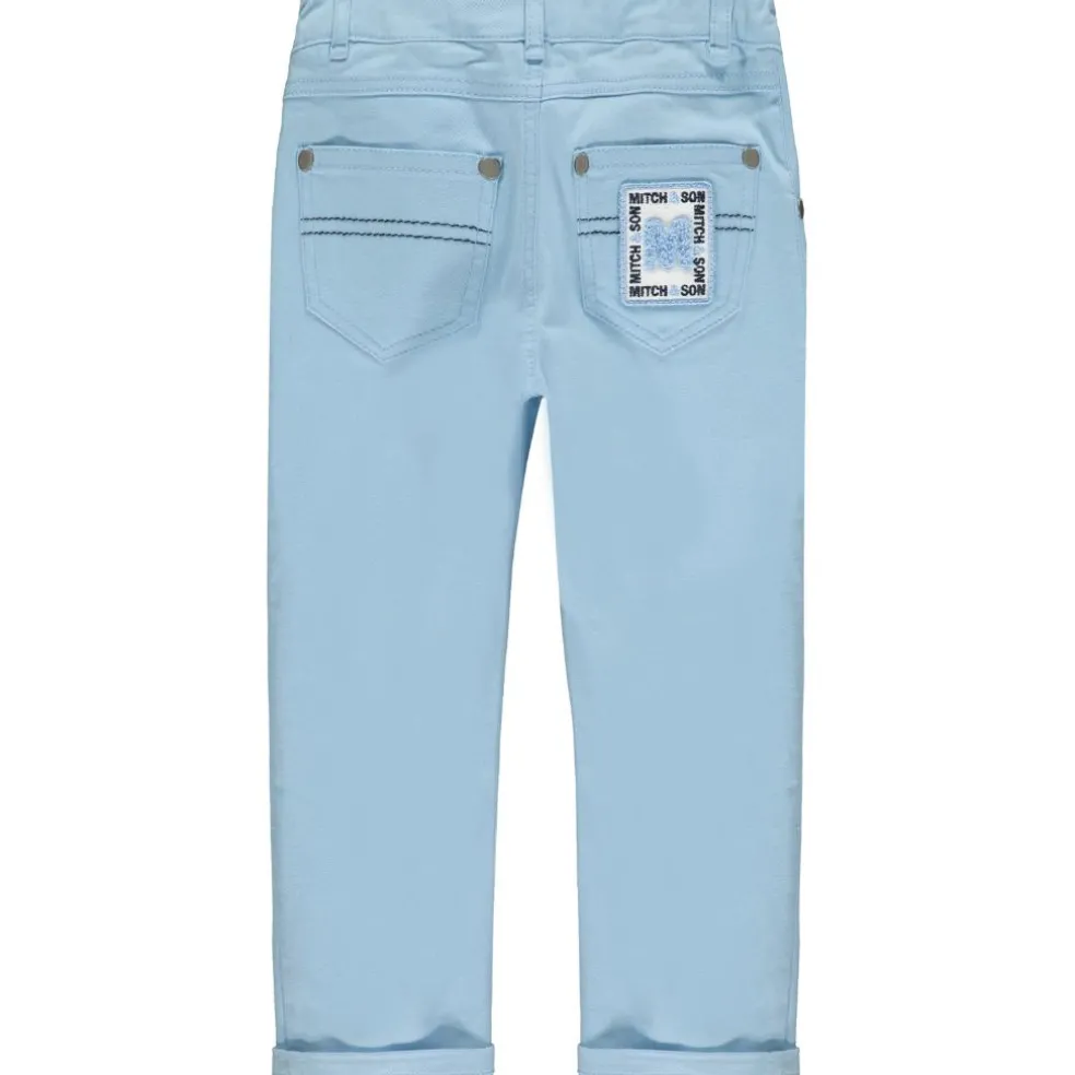 Building blocks, Stretch twill trouser with adjustable waistband, small logo print on side and felt logo on back pocket.