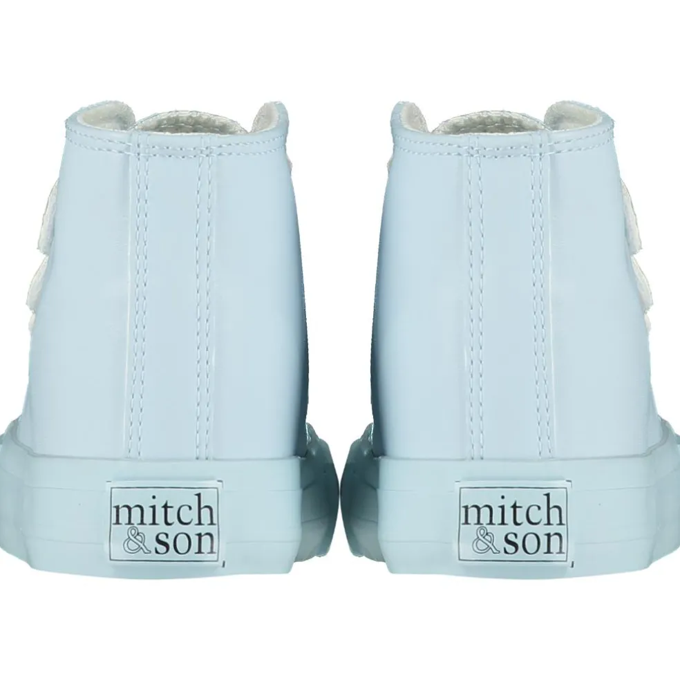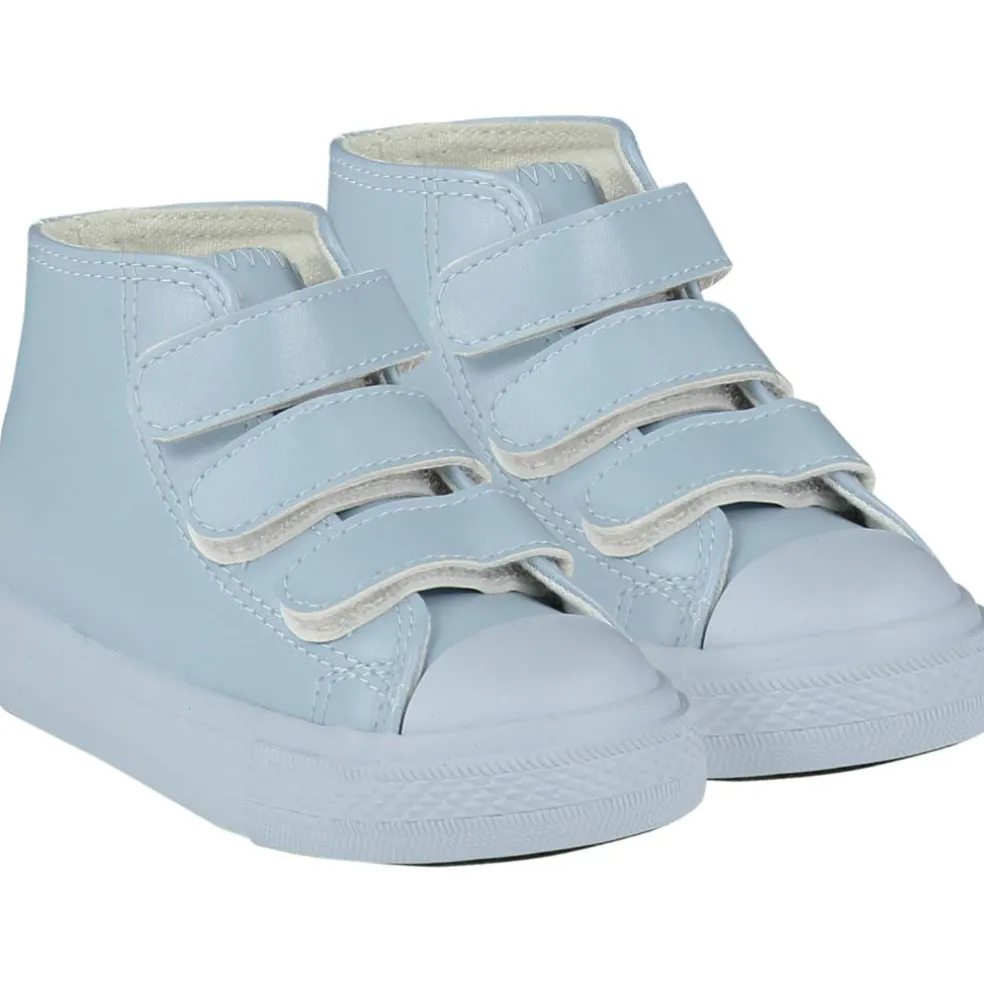 Triple velcro high top with logo on heel.