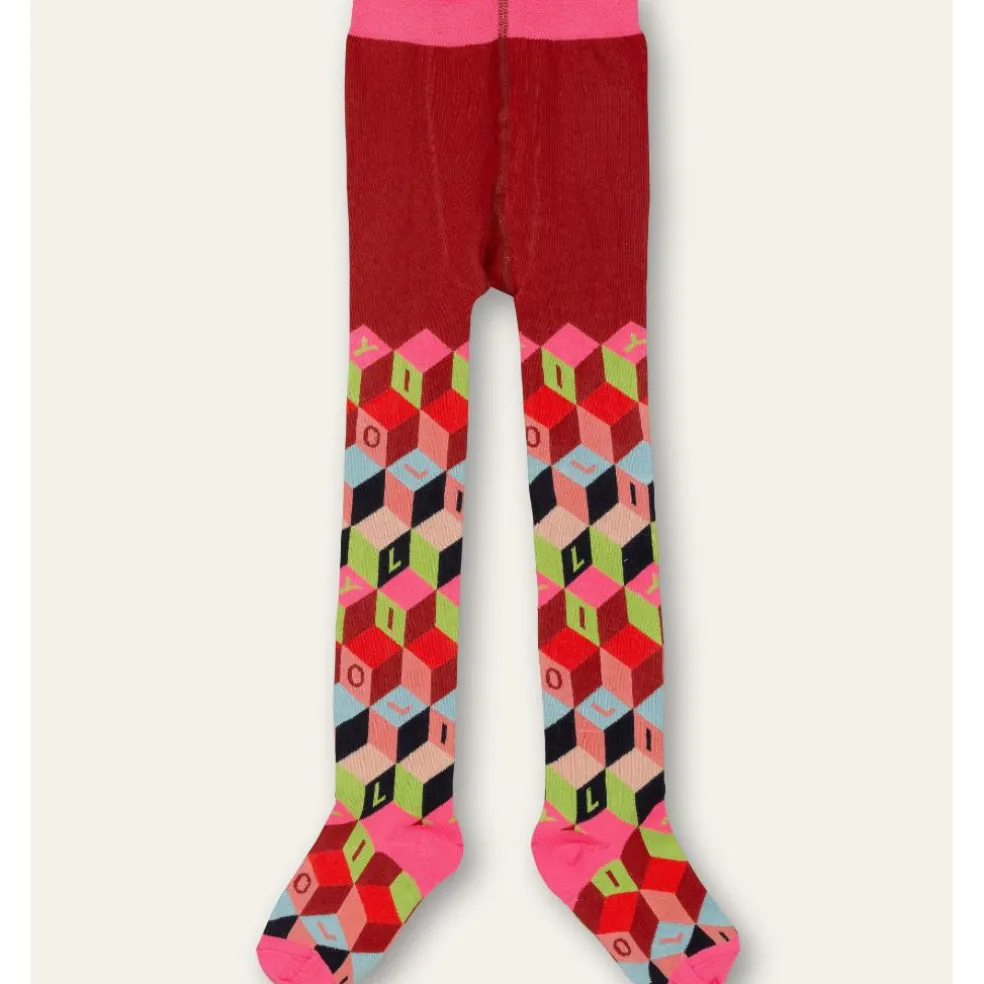 Tights in ketchup red withbright pink, green and baby-blue coloured blocks.