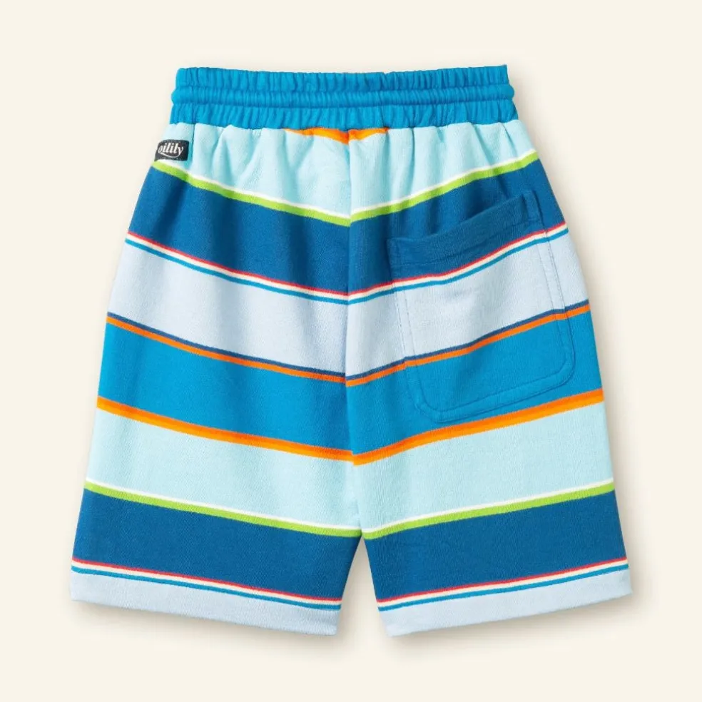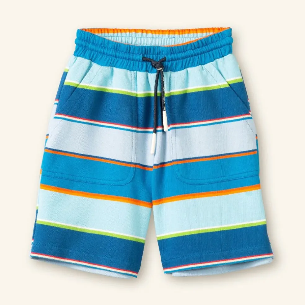 Superstriped shorts for super kids! Feel free to go with the flow. It has an elastic waistband, black drawstring and 3 pockets. – Relaxed fit