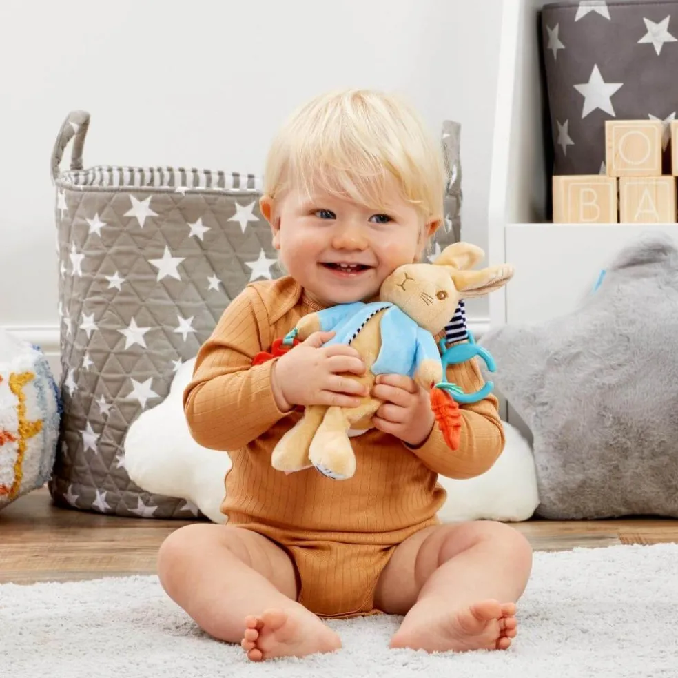 Playtime with Peter Rabbit! There’s plenty of fun and games to be had with the fun-packed Peter Rabbit Activity Toy. Designed to stimulate baby’s senses and encourage early sensory development, this super soft toy rattles and squeaks as baby plays, and features an attached teether, crinkle-sound fabric, different textures and silky tags for little fingers to explore. Complete with a handy clip hook to attach to bags, buggies and cots, the Peter Rabbit Activity Toy will keep your baby busy when you’re on the go, and is the perfect companion for adventure-filled days!