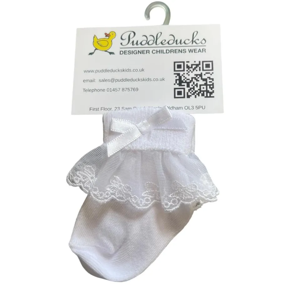 Wonderful baby and girls frilled socks are made from super-soft cotton-rich material. The turnover top has a pretty bow design organza frill and there is a dainty satin ribbon bow at the ankle.