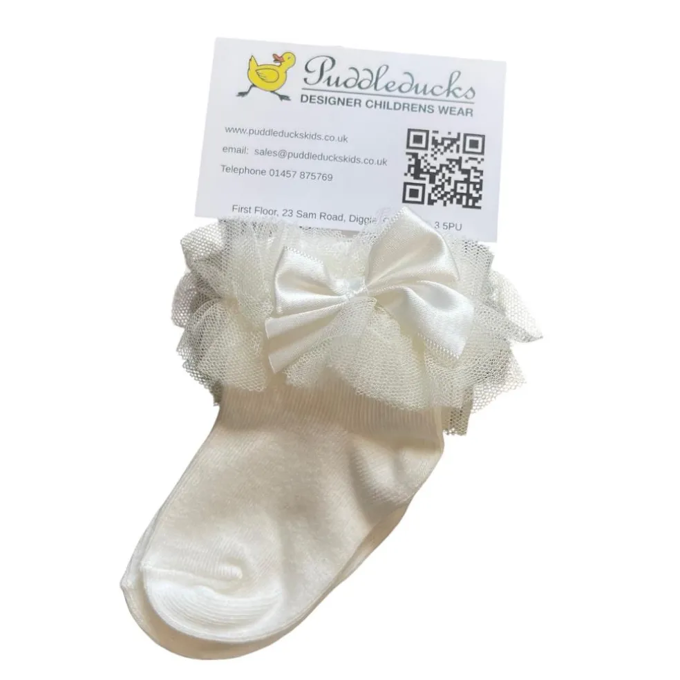 Wonderful new design organza frilled cotton-rich socks. The generous organza ruffle has a pretty satin bow on one side.