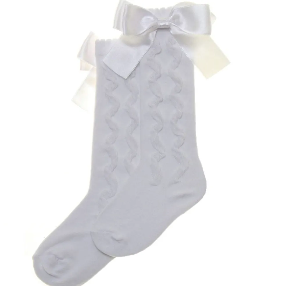 Knee high sock in white with large ribbon bow to the side top of the sock.