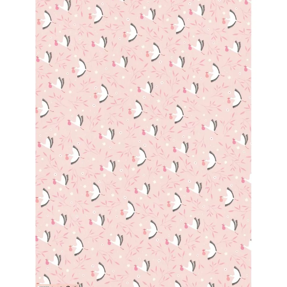 A sheet of high quality new baby wrapping paper. The pattern features storks holding pink bundles, surrounded by leaves and flowers, on a pink background.
