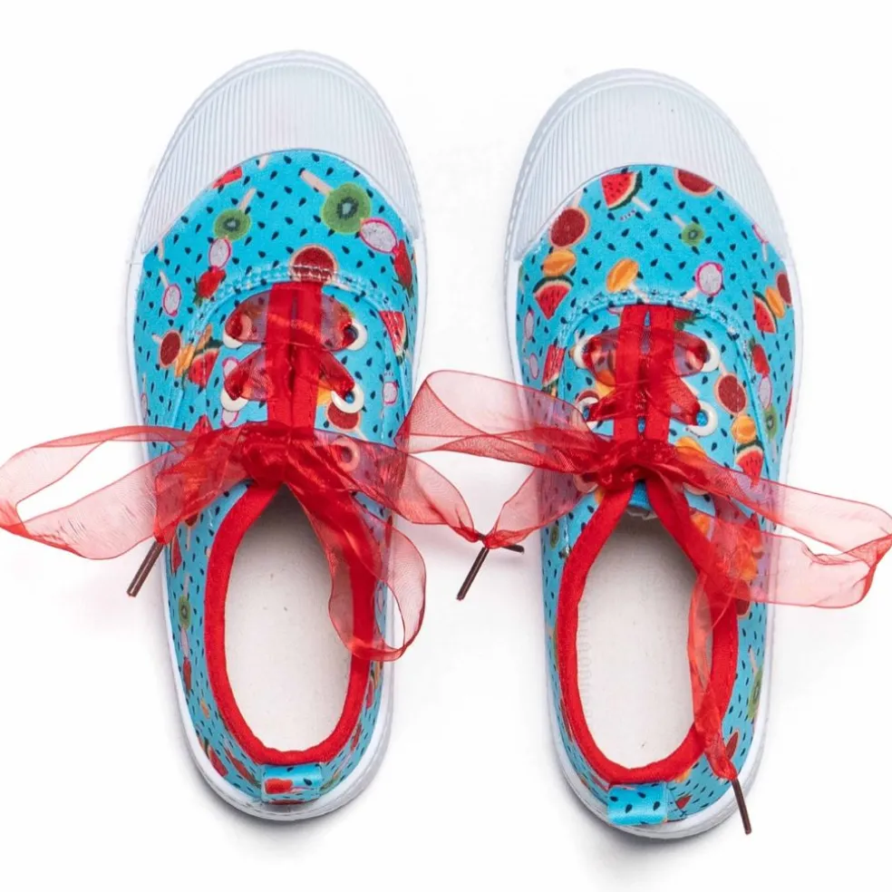 Canvas pumps with a “fruit” printed design and red laces.