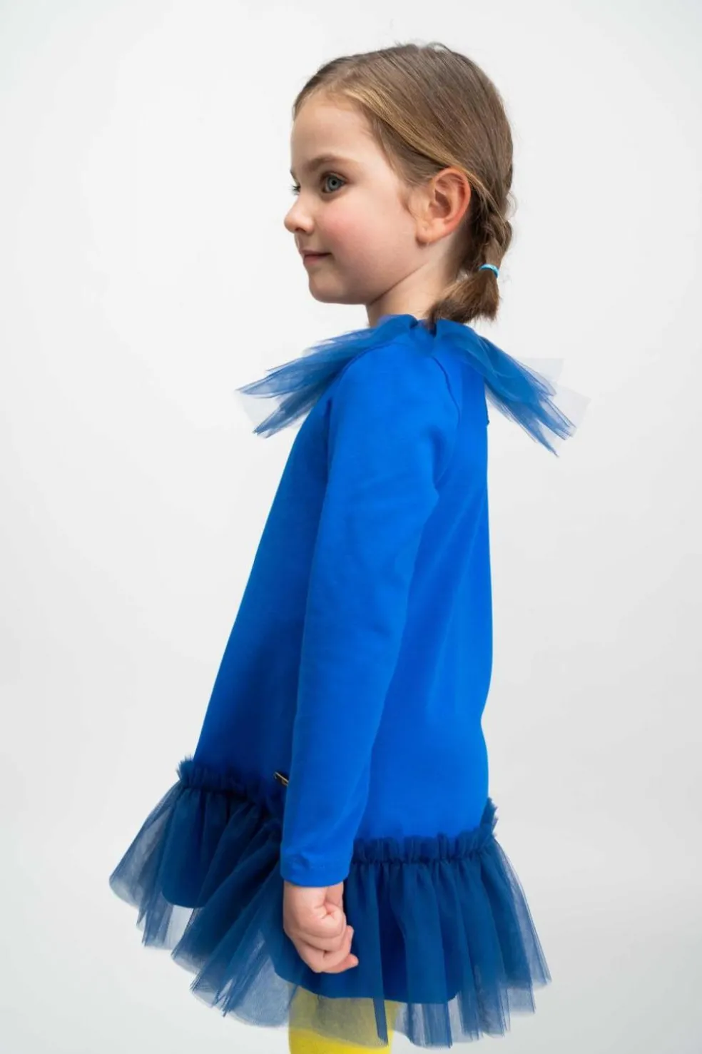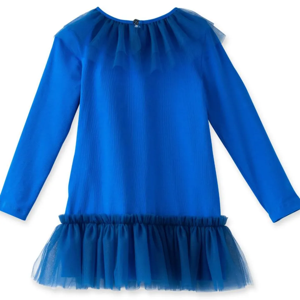 Long sleeved dress which is finished with a tulle ruffle around the neck and hemline.
