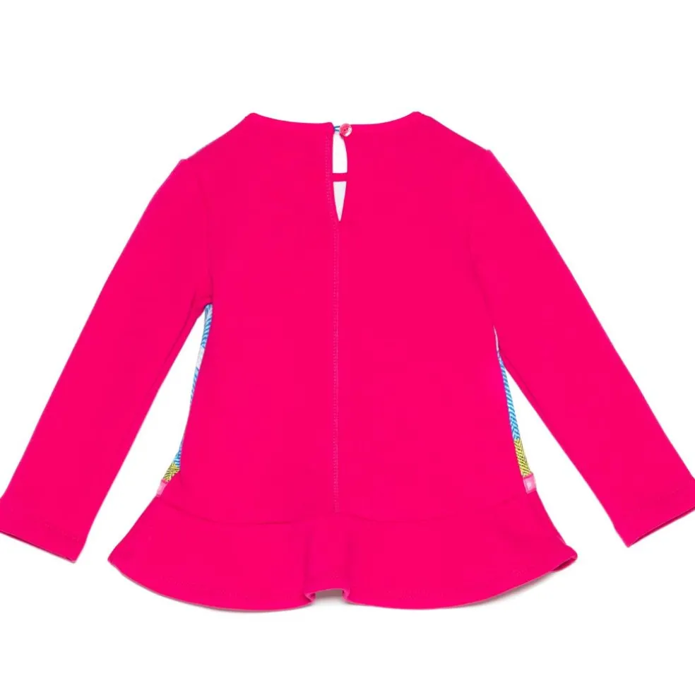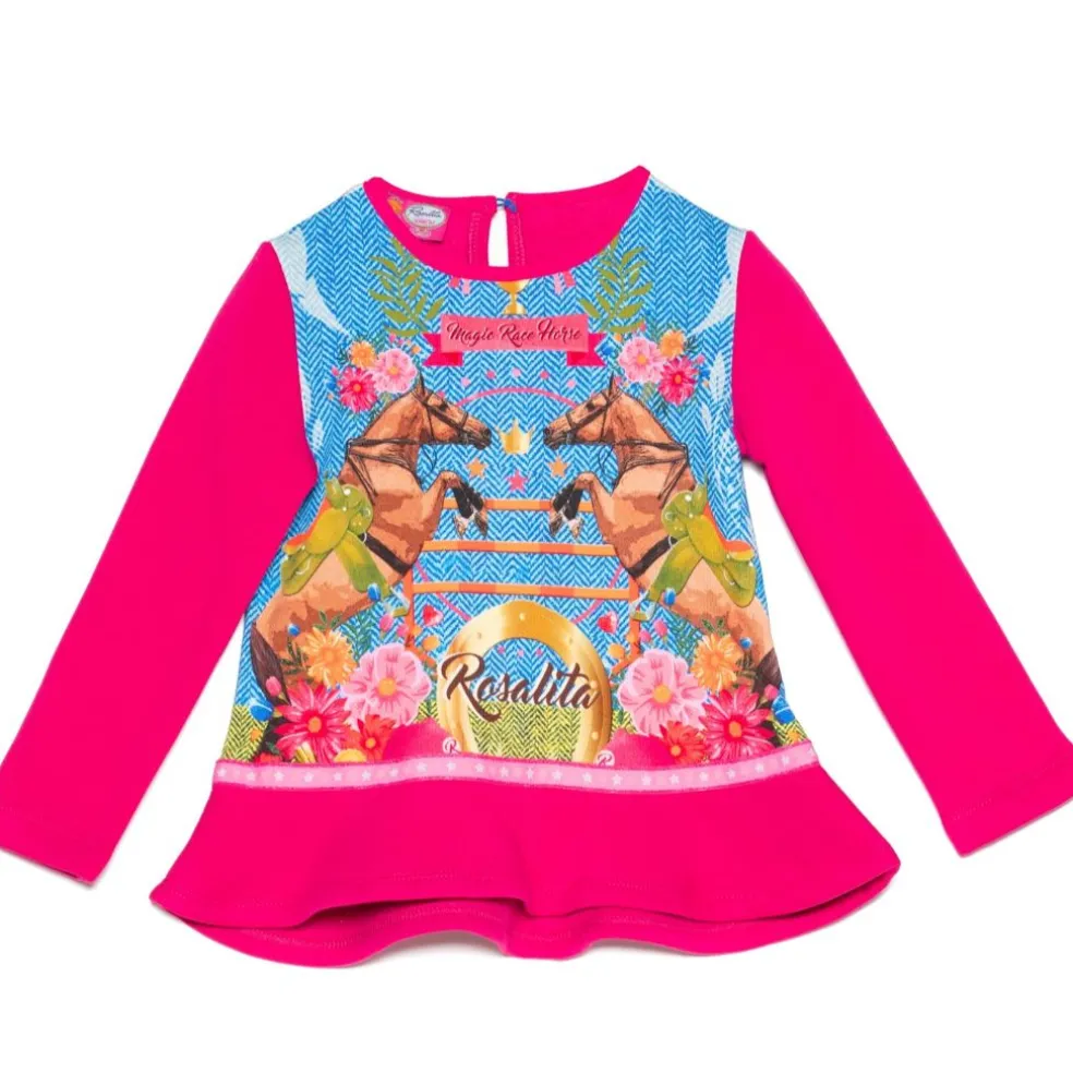 Sweatshirt with printed front, plain sleeves and back finished with a frilled hemline.