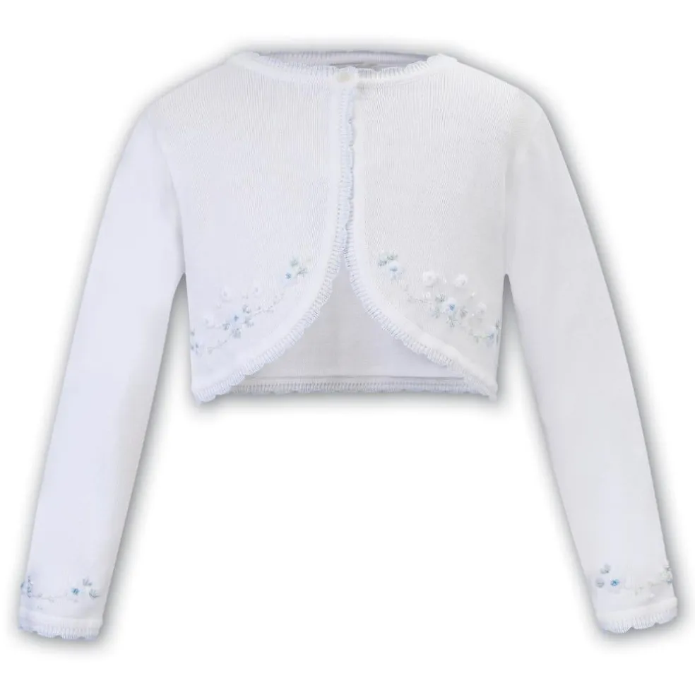 White Bolero in 100% soft Organic Cotton, this design is hand-embroidered with blue flowers with a beautiful knitted scalloped trim. A summer wardrobe essential.
