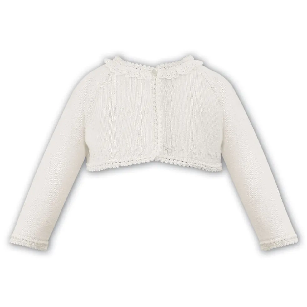 Long sleeved bolero cardigan with a single button fastening at the neck, broiderie anglaise trim to collar and finished with hand embroidered detailing.