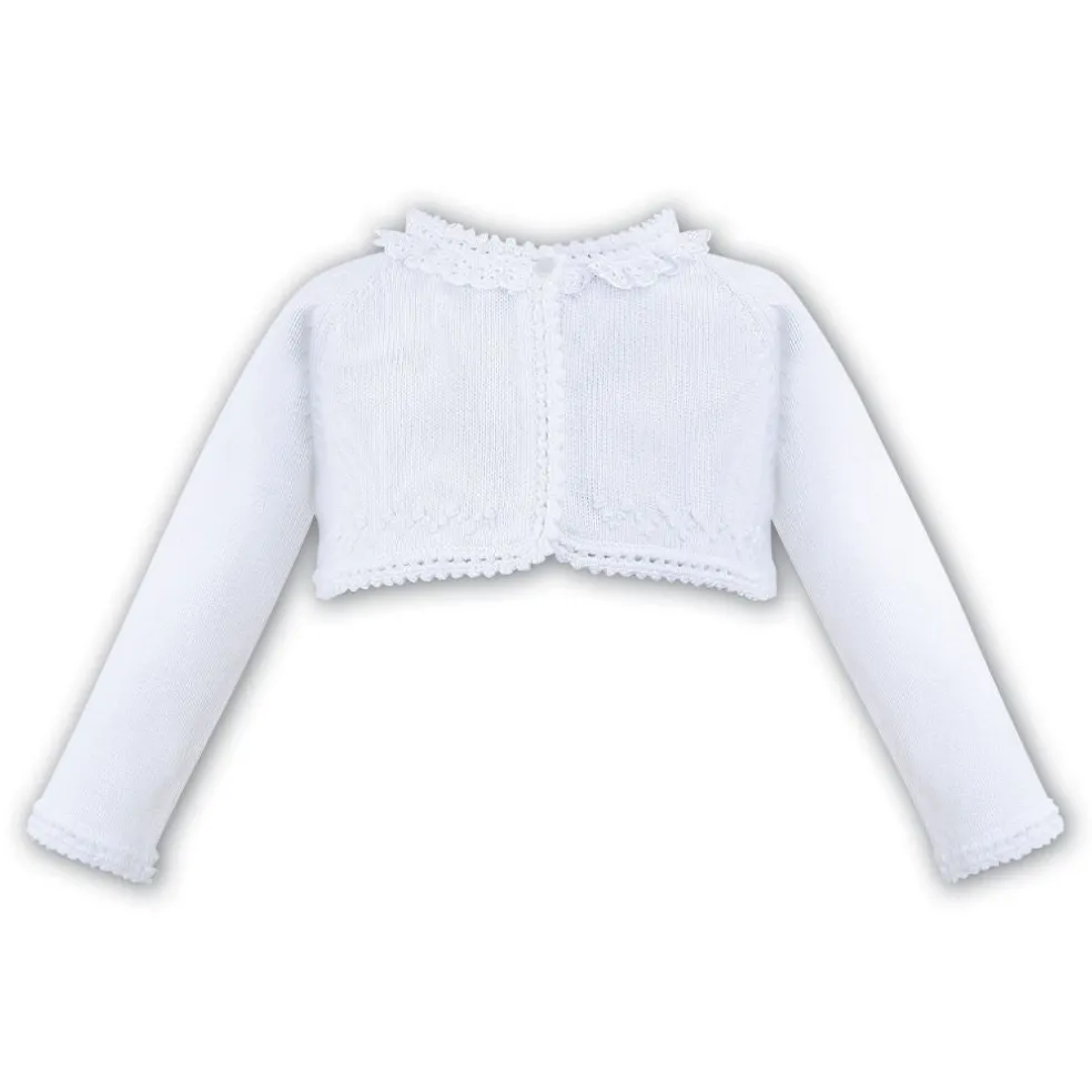 Long sleeved bolero cardigan with a single button fastening at the neck, broiderie anglaise trim to collar and finished with hand embroidered detailing.