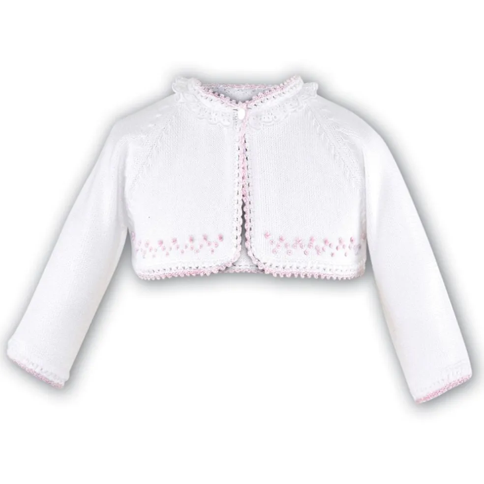 Long sleeved bolero cardigan with a single button fastening at the neck, broiderie anglaise trim to collar and finished with hand embroidered detailing.