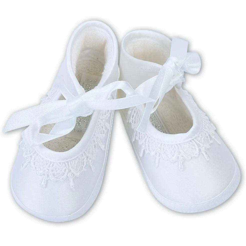 A Traditional White Satin Shoe, with a delicate lace trim and an elegant satin ribbon ankle tie. Perfection for any occasion.