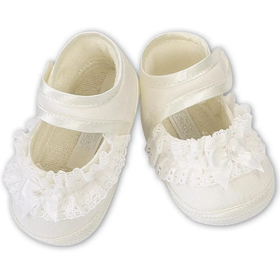 An elegant silk shoe, with a delicate lace frill trim and a beautiful satin bow detail.