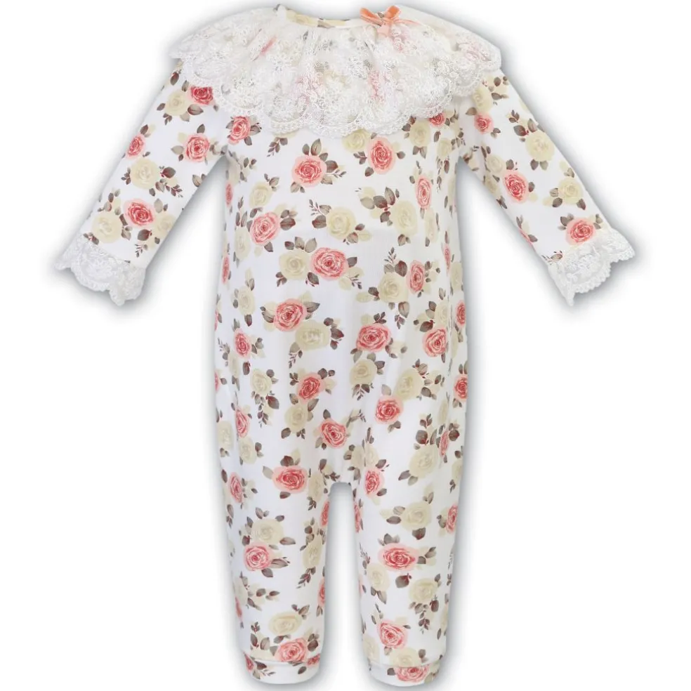 All in one in an all over rose print design fabric, has a back button fastening and a pretty scalloped lace trim to collar and cuffs.