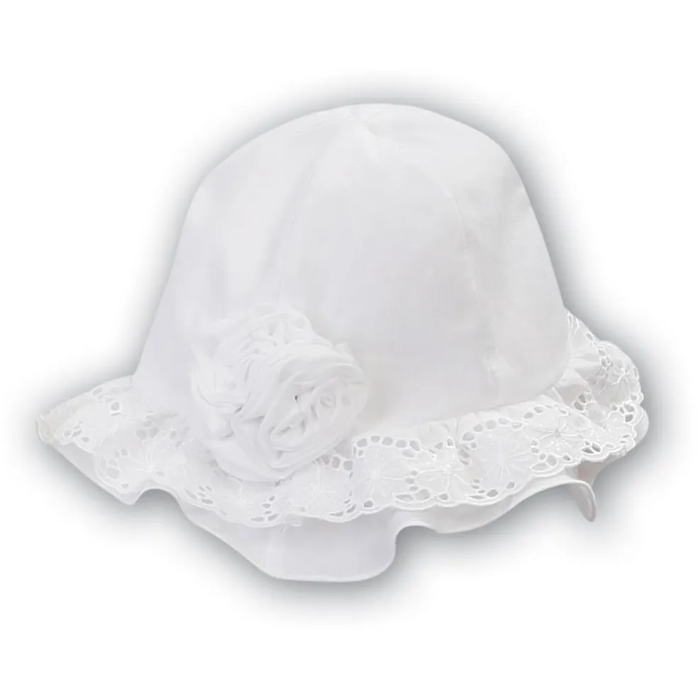 A pretty lightweight sunhat with a broderie anglaise trim and appliqued flower on the front.
