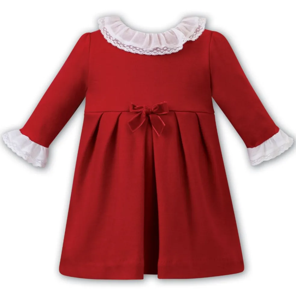 Fully lined soft jersey dress, finished with a ruffle collar and cuffs edged in a lace trim. Back button fastening and an appliqued velvet bow on the front.