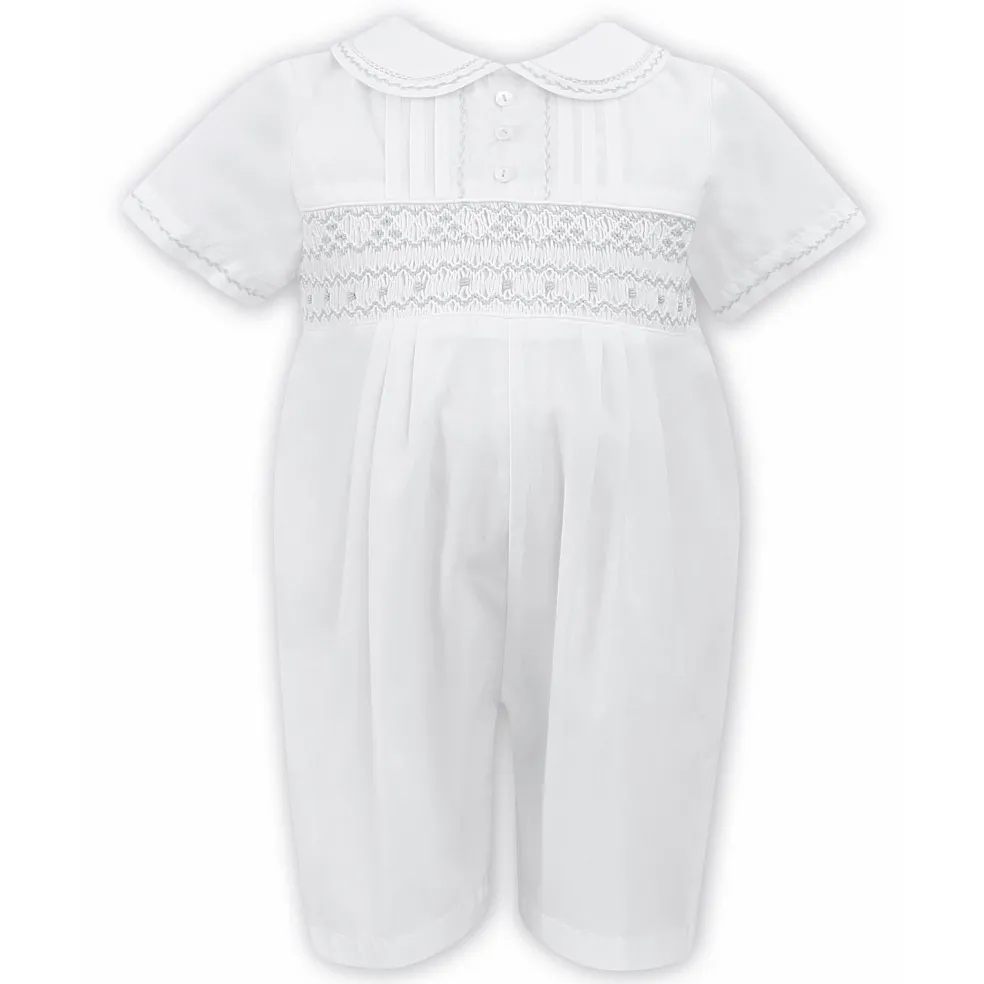 Short romper with hand smocked and hand embroidered detailing, finished with a round collar, shell buttons and pintucks.