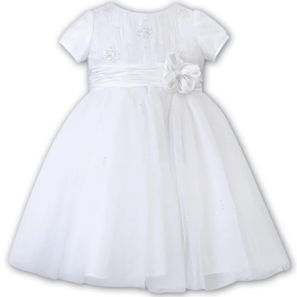 Ceremonial ballerina dress in white, with a delicate hand-pleated bodice with clusters of flowers adorned with pearls and a beautiful satin flower at the waist.