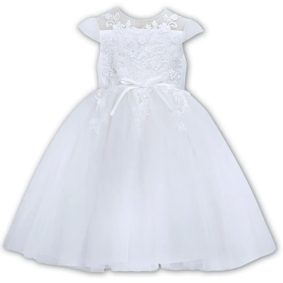 Our ceremonial ballerina length dress, the finest lace is delicately placed by hand creating a design that flows elegantly across the gown. The bodice is adorned with beautiful appliquéd flowers and tiny pearls, a luxurious Satin bow emphasises the waistline. The dress fastens at the back with a concealed zip, designed with layers of soft tulle create added volume to the dress.