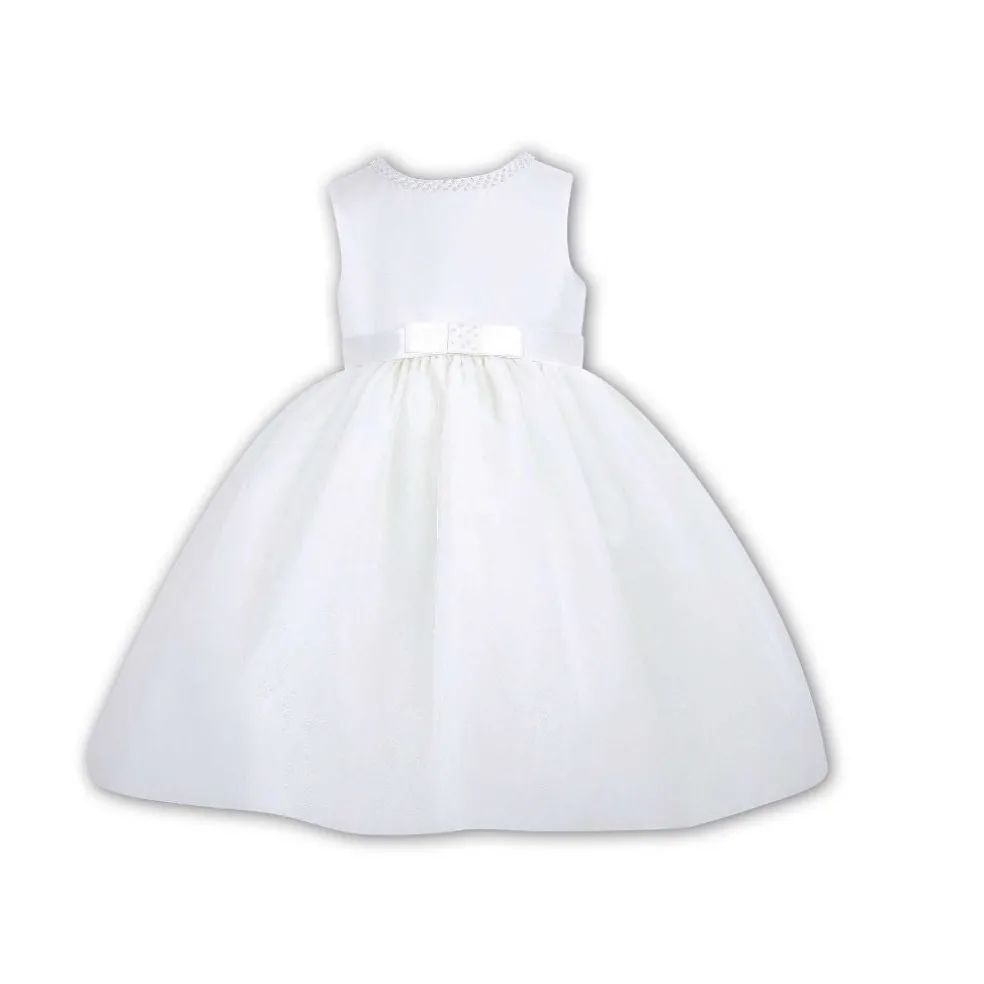 Sleeveless fully lined ballerina length dress with a tulle overlay on the skirt and is finished with seed pearls around the neckline, a satin ribbon around the waist and a small bow at the back. Underskirt has a layer of net to make the dress puff out.