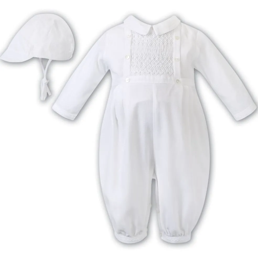 Long sleeved hand smocked and hand embroidered all in one with back button fastening, buttons on the legs for easy changing. Elasticated legs, supplied with a matching cap.