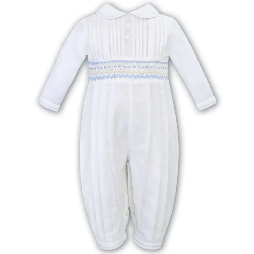 Fully lined long sleeved romper with back button fastening and buttons on the legs for easy changing. The romper is finished with pin tucks on the front and has a hand smocked and hand embroidered band at the waist.