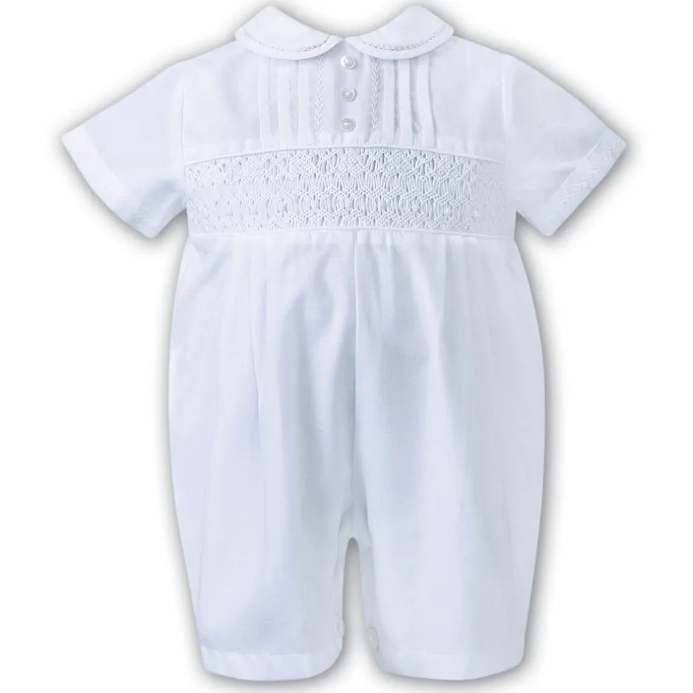 Boys Romper in Pastel White, with an intricate panel of signature hand-smocking, a Peter Pan Collar with a feather stitch detailing and pearl buttons.