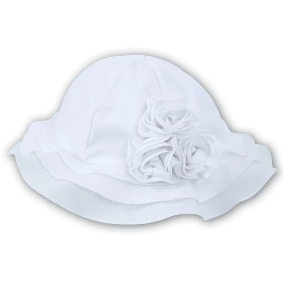 Gorgeous baby girls sunhat with a beautiful scalloped trim and delicate rose floral detail.
