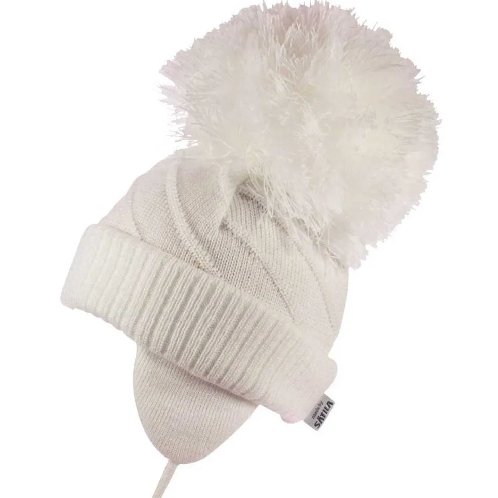 Knitted hat with a large pom pom, ear flaps and tie fastening. Hat has a half knitted cotton lining for extra comfort and warmth.