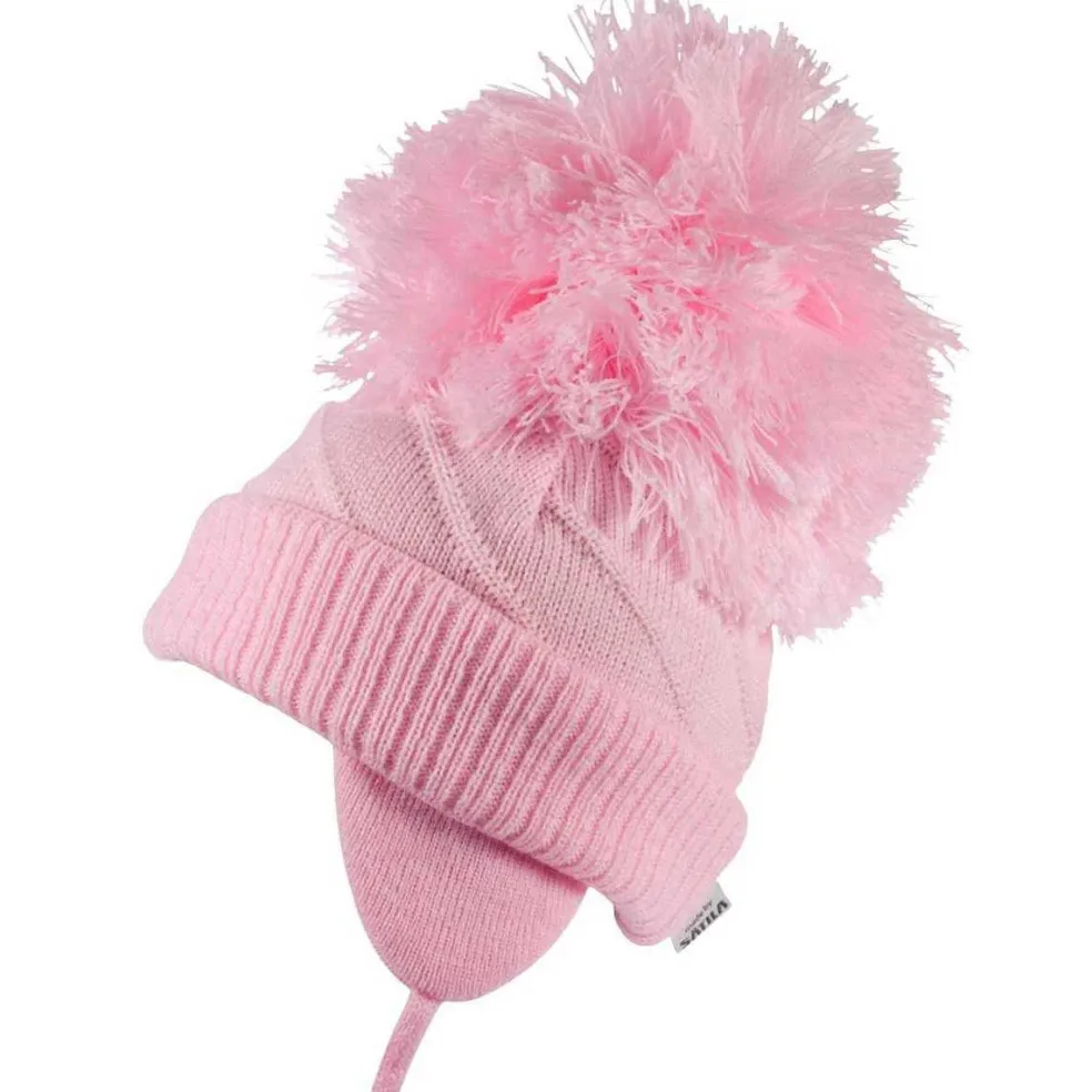 Knitted hat with a large pom pom, ear flaps and tie fastening. Hat has a half knitted cotton lining for extra comfort and warmth.