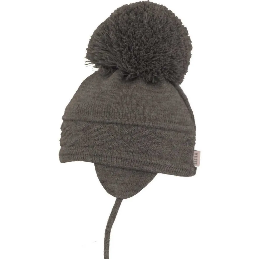 Knitted hat with a large pom pom, ear flaps and tie fastening. Hat has a half knitted cotton lining for extra comfort and warmth.