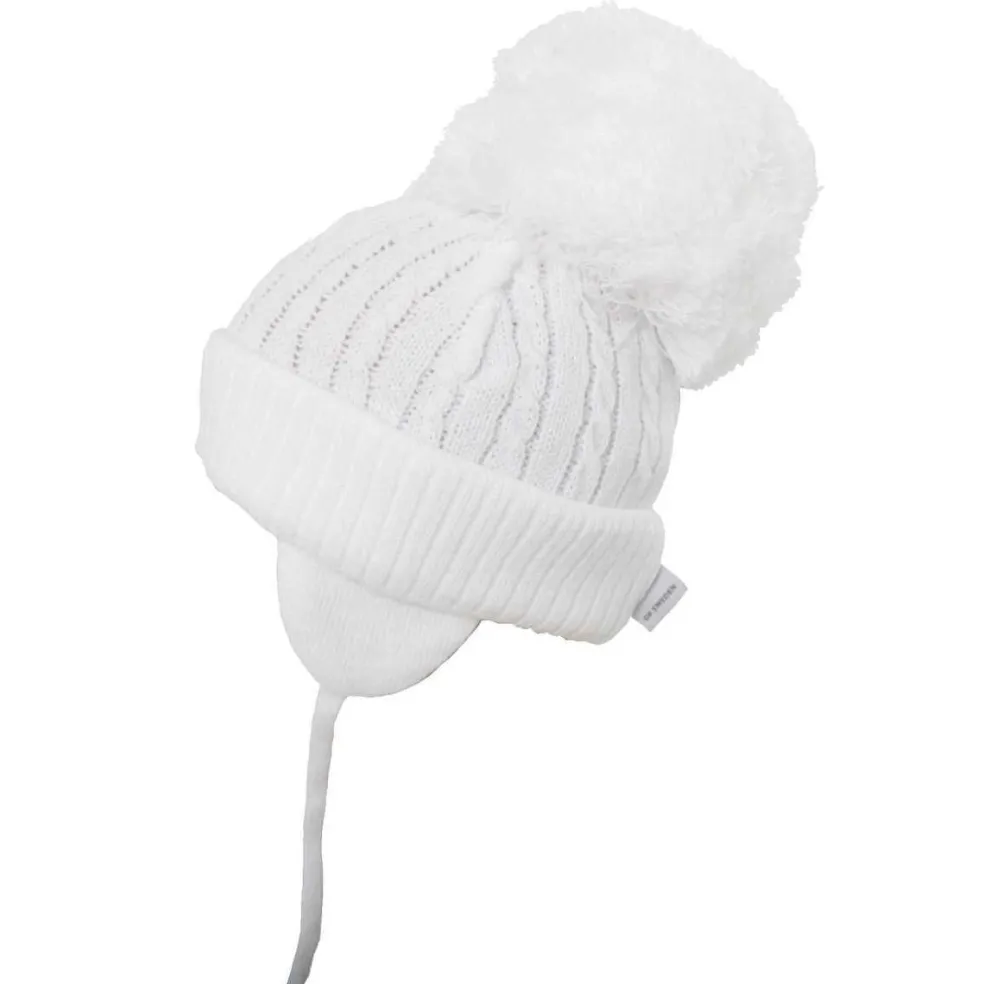 Knitted hat with a large pom pom, ear flaps and tie fastening. Hat has a half knitted cotton lining for extra comfort and warmth.